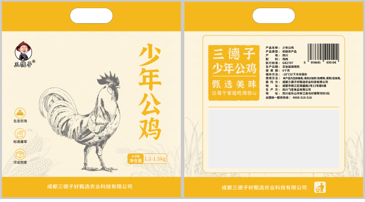 记者从涉事公司所销售产品包装袋上发现,使用的是“三德子”商标。但在“少年公鸡”或“青年公鸡”前面,均标注有“德子土鸡”字样。