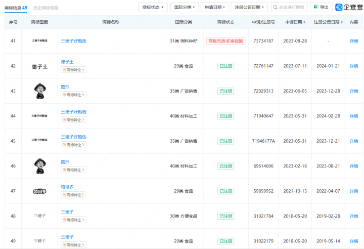 川观新闻记者通过国家知识产权局商标局公开网站查阅到,三德子公司共申请注册49个,其中已注册成功“三德子”“三德子好甄选”“德子土”“鸡可多”等商标共计12个,注册申请中有20个,除去被驳回的,与三德子和鸡相关的商标有39个。其核心商品类别属于商标第29类,已申请的商品/服务主要包括:鸡肉、肉、腌制肉、家禽(非活)、蛋等。